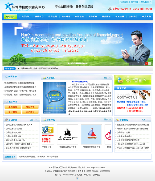 核心提示:蚌埠華信商務中心 成立于2008年,公司主要從事工商登記注冊、會計代理記賬及財務咨詢、稅務代理及策劃、審計、驗資、資產(chǎn)評估等相關業(yè)務。我公司是一批由高水平、高素質(zhì)、責任心強的專業(yè)人員組成的隊伍,具有完善的管理制度,規(guī)范的財務操作流程和嚴格的保密