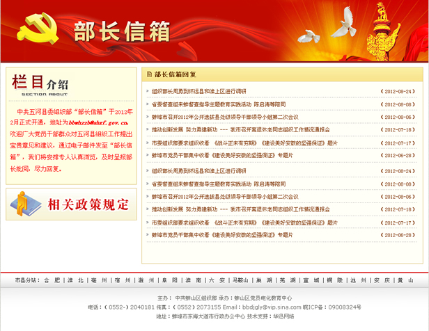 中共五河縣委組織部“部長信箱”于2012年2月正式開通,地址為bbwhzzb@ahxf.gov.cn。歡迎廣大黨員干部群眾對五河縣組織工作提出寶貴意見和建議,通過電子郵件發(fā)至“部長信箱”,我們將安排專人認真瀏覽,及時呈報部長批閱,盡力回復(fù)。